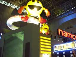ナムコブースは、パックマンのバルーンが目を引く。 ブースの屋上で、ギャルたちのショウタイムが始まった! |