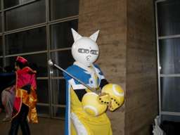 しずかちゃんのコスプレをしているコンパニオンを発見!早速激写! 後ろの押し入れからは、ドラちゃんがこちらを伺っている。 |