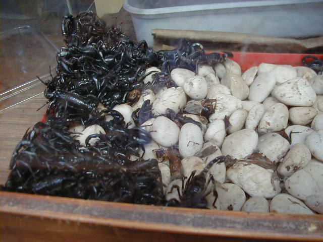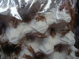 爬虫類のエサ用にコオロギがパックされて売られている。パックが破れているのか、床にはコオロギが数匹跳ね回っていた。 | |