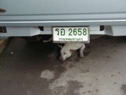もちろんこの日も最高気温36-37℃。自動車の下で犬がぐったりしている。 |