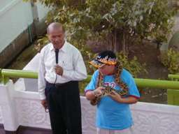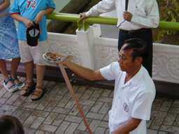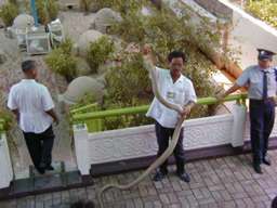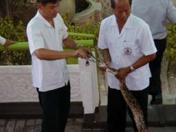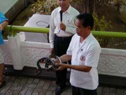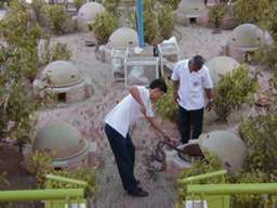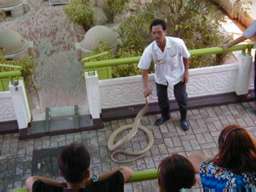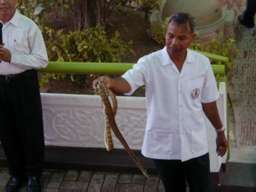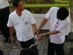 蛇の毒を採取するパフォーマンス。 右の写真は、アナコンダに鶏のもも肉を7個ほど無理やり食わせている。 |