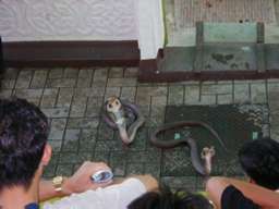 研究施設の裏手には、毒蛇の飼育されている小屋や円形のステージがある。 入場料は、70バーツ(約210円)で、毎日1、2回、職員によりスネークハンドリングショーが催される。 |