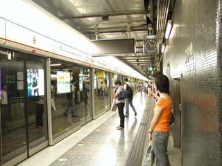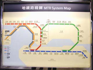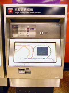 | トル公: | 香港の地下鉄路線図と券売機。目的地を押して表示される金額を投入すると切符が出てくる。 地下鉄の一部の駅はご覧のようにホームと線路の間に仕切りがあり安全。 |