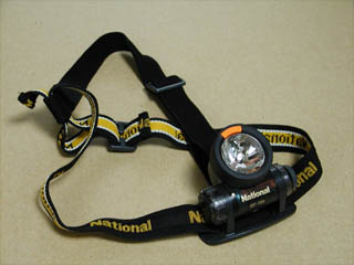 | ヘッドライト | 夜に登るので、ヘッドライトを準備しました。遠くを照らすクリプトンミニチュア球と手元を照らすLEDの切り替えができ、ライトの角度が変えられるものを選びました。そこまでのものは必要なかったかも知れませんが、角度を変えられるのは険しい岩場を登るときに足下を照らすのに便利でした。普通 の懐中電灯でも良いかも知れませんが、片手には杖を持ち、片手には懐中電灯ってことになると、両手がふさがるのでいささか不安です。登山ルートには手を使って登ったほうが良いような場所もありましたから。 |